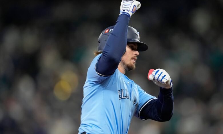 Addison Barger’s ninth-inning solo shot was among five Blue Jay home runs at Seattle’s T-Mobile Park in Wednesday’s Game 3. Seattle leads the series 2-1, and Toronto is looking to pull even with the Mariners in Game 4 on Thursday evening. (David J. Phillip/The Associated Press)