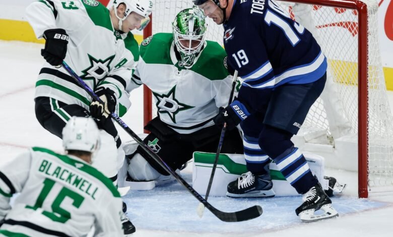 Dallas Stars’ Esa Lindell (23) and goaltender Jake Oettinger defend against Winnipeg Jet Jonathan Toews during the second period of Thursday’s game in Winnipeg. (John Woods/The Canadian Press)