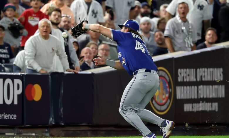 Addison Barger of the Toronto Blue Jays is seen dropping a ball during Tuesday’s Game 3. The Jays lost 9-6 to the Yankees. (Al Bello/Getty Images)