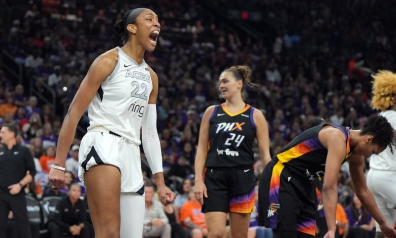 Las Vegas Aces center A’ja Wilson, left, reacts after scoring against the Phoenix Mercury during the first half of Game 4 of the WNBA basketball finals in Phoenix on Friday. (Rick Scuteri/The Associated Press)