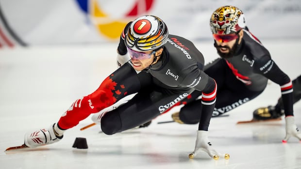 William Dandjinou from Sherbrooke, Que., finishes first in the 1,000-metre final to win all three men’s individual events at the ISU Short Track World Tour stop in Montreal. Steven Dubois of Terrebonne, Que., finishes second.