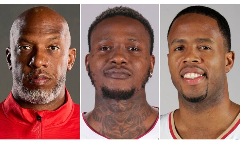 This combo of images shows, from left, Portland Trail Blazers head coach Chauncey Billups, Miami Heat guard Terry Rozier and former Cleveland Cavaliers’ Damon Jones. (The Associated Press)