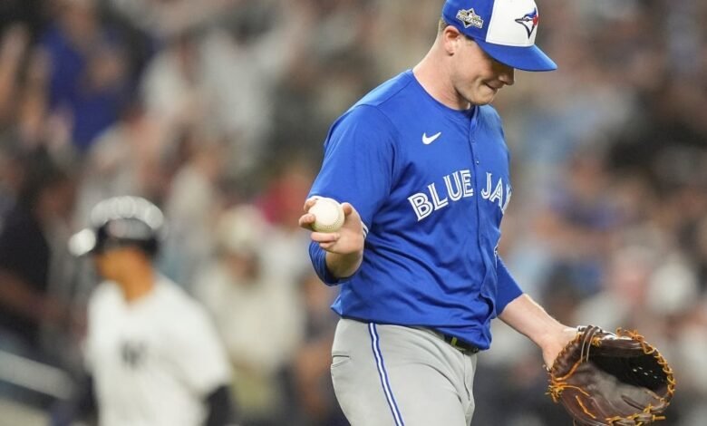 Toronto Blue Jays pitcher Louis Varland reacts after giving up a three-run home run to Yankee Aaron Judge during the fourth inning of Game 3 of the American League Division Series in New York Tuesday. (Frank Franklin II/The Associated Press )